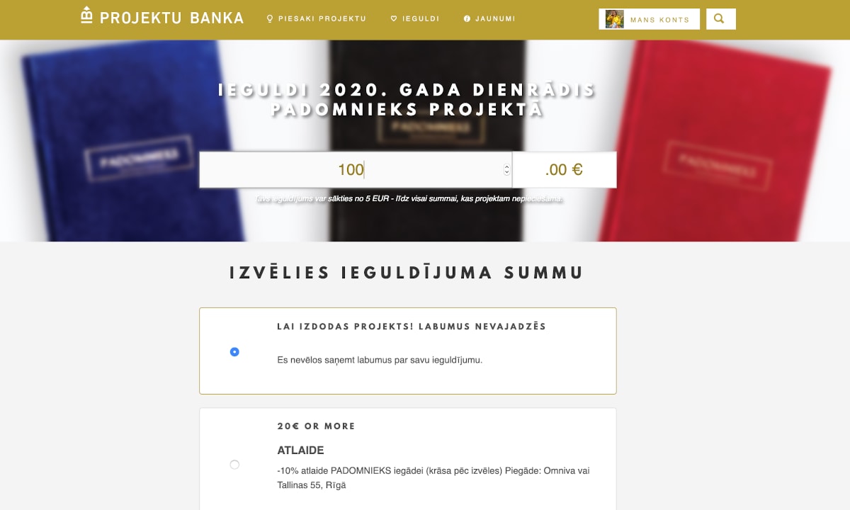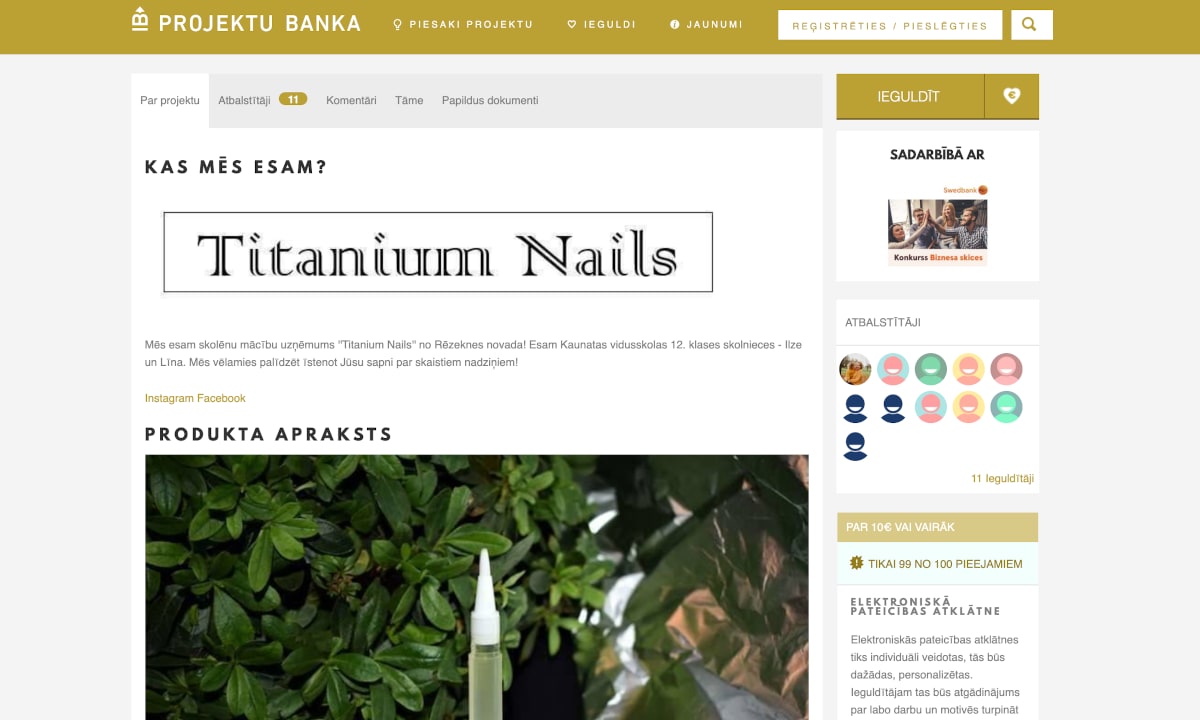 Lai laba ideja kļūtu par labu plānu, ir jāatrod īstais gals, no kura ķerties klāt. Kad ir idvesma un ideja, ar ko sākt, ir nepieciešams finansiāls atbalsts. Šajā brīdī palīgā nāk portāls ProjektuBanka.lv, kas ir pūļa finansēšānas projekts un ļauj katram kaut ar nelielu ieguldījumu sniegt savu artavu.